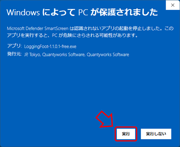 Logging Foot は Certum Code Signing 2021 CA によるコード署名を行っていますが、新しいバージョンやリリース直後のダウンロード数が少ない場合、インストール時に Windows SmartScreen 機能により「Windows によって PC が保護されました」と表示されることがあります。